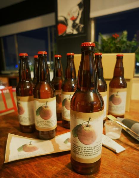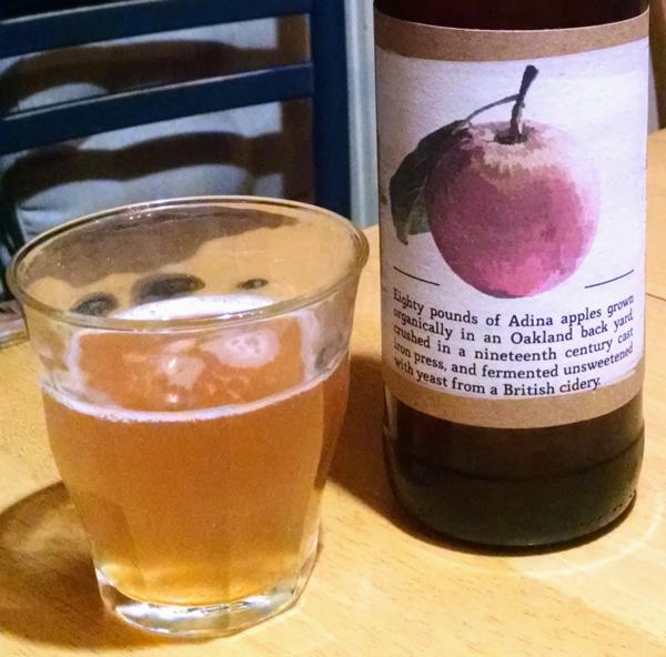 Eighty pounds of Adina apples from a backyard in the Oakland hills, crushed, pressed, and fermented with WLP775 into a very dry, tart, sparkling cider:
