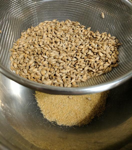 - I dried the grain in two stages in a dehydrator (110F until below 10% moisture, then 150F until below 6% moisture, based on periodically weighing a sample of the barley compared to its original weight) to halt germination, and then sieved off the withered rootlets.