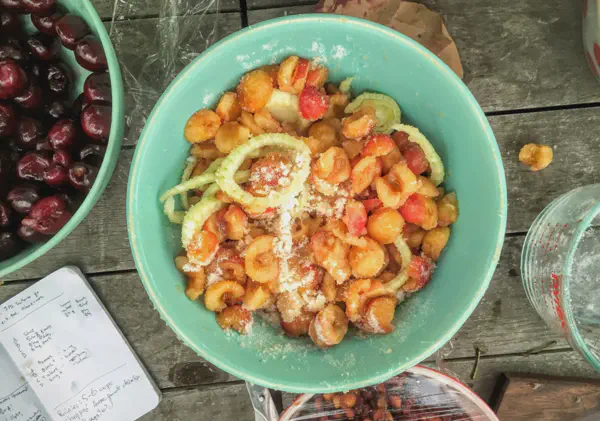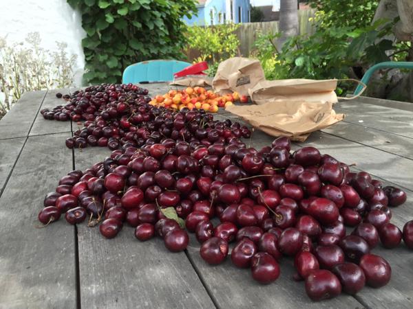 One summer we picked a large quantity of Bing, Brooks, Rainier, and Tulare cherries. One way to preserve their flavors was in a shrub: macerating them in sugar with various other flavors, then straining and adding vinegar both for flavor and to help make the syrup shelf-stable. The best of this batch combined Rainier cherries with fennel, cider vinegar, and champagne vinegar. Other experiments included cherry-bay leaf-peppercorn, cherry-ginger, and cherry-vanilla.